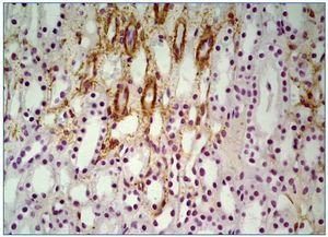 In conclusion, we can confirm the presence of ghrelin in tubular epithelial cells in normal and diseased human kidneys. Lack or low level of this protein in proliferative glomerulopathies may be, in part, responsible for interstitial accumulation of monocytes/macrophages in these cases.