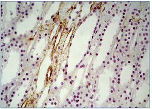 Figure 2. Intense focal immunoexpression of ghrelin in epithelial cells of thin portion of the Henles loops and several distal tubuli in NPG case. x200.