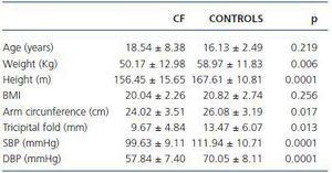 The CF patients presented SBP and DBP values significantly lower than those of the control subjects (table 1.) A multivariate adjustment was performed which included age, sex, height and weight. After this adjustment, the differences in SBP and DBP did not prove to be statistically significant.