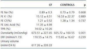 Different parameters of renal function were compared in both study groups (table 2.) The CF group patients presented values comparable to those of the control subjects for fractional excretion of sodium, chloride and potassium. Furthermore, the CF patients presented height estimated glomerular filtration rates that were similar to those of the control group (table 2.) Significantly lower urinary osmolarity was observed in the CF patients.