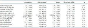 The hyperproteic content in the diet of these patients, as well as the intestinal loss of bicarbonate, bring about a reduction in urinary citrate concentration.22 The urinary citrate value in this sample is clearly abnormal when compared with the normal reference values in specialised literature.