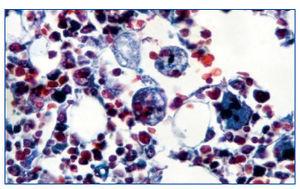Figura 1. Tricrómico. Histiocitos con hematíes en su interior indicando su actividad hematófaga en la médula ósea.