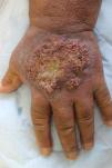 Fue derivado a consulta de dermatología para valoración de una placa de crecimiento progresivo en el dorso de la mano izquierda, de aspecto verrucoso, con ulceración central, coloración marrón-violácea y bordes bien definidos (fig. 3). El estudio histológico mostró, en dermis superficial, múltiples capilares de pared gruesa revestidos por células endoteliales sin datos de atipia, así como extravasación de hematíes y presencia de hemosiderófagos (fig. 4). El cultivo microbiológico de la lesión cutánea fue negativo.