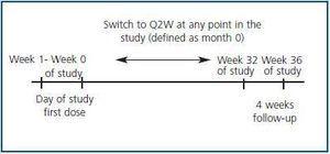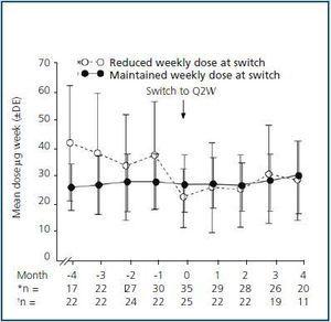 Q2W dosing equivalent to twice the previous QW dose resulted in more stable Hb levels (80% of patients in the maintenance dose group maintained Hb levels ³ 11 g/dL at Month 4 after conversion, compared with 51.4% of patients in the reduced weekly dose group), and required less frequent and smaller dose adjustments to maintain the target Hb level. In contrast, patients who had their weekly dose reduced at switching required dose increases to ensure maintenance of the target Hb level. Therefore, it is important to maintain a weekly dose (Q2W dose equivalent to twice the previous QW dose) when switching from QW to Q2W.
