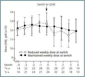 A significantly higher percentage of patients in the maintenance group maintained Hb levels ³ 11 g/dL at Month 4 after switching (80%) compared with those who received a reduced weekly dose (51.4%) (p = 0.0236). The percentage of patients with Hb levels between 11 and 13 g/dL was 44% for the maintenance group and 20% for the group who received a reduced weekly dose (p = 0.0455).