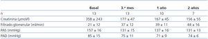 En la tabla 1 puede observarse la evolución global de los pacientes después del procedimiento. Se objetivó una mejoría progresiva de la función renal durante los 3 primeros meses que permaneció estable durante los dos años siguientes. Por otro lado, mejoraron las cifras de presión arterial en los dos primeros años, manteniéndose estable la media de fármacos antihipertensivos administrados (2,5 fármacos por paciente). La figura 1 refleja la evolución de la función renal de cada uno de los pacientes estudiados.