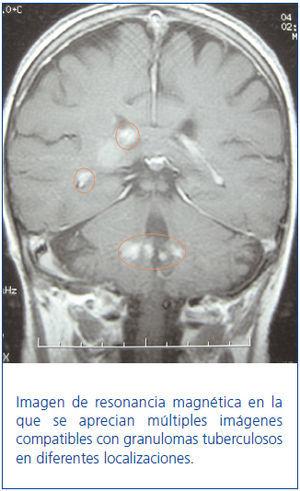 Mujer de 66 años, con insuficiencia renal crónica secundaria a poliquistosis hepatorrenal, que recibió un trasplante renal de cadáver y tratamiento con baxilisimab, esteroides, micofenolato mofetil y tacrolimus. Sufrió un rechazo agudo tipo IIb córtico-resistente que precisó tratamiento con OKT3. A los cuatro meses ingresó por fiebre, malestar general y astenia intensa. Fue diagnosticada de tuberculosis pulmonar sospechada por tomografía computarizada (TC) torácica y fibrobroncoscopia y confirmada por tinción de Ziehl-Neelsen y cultivo de Löwenstein. Se pautó tratamiento con rifampicina, isoniazida y piracinamida durante dos meses, y rifampicina e isoniazida cuatro meses más. A los 15 días reingresó por confusión, cefalea occipital y alteraciones visuales. En una resonancia cerebral se vieron múltiples nódulos hiperintensos en T2, con realce focal nodular, en áreas frontal derecha, subcortical, suprasilviana, occipital derecha y en pedúnculos cerebelosos, indicativos de infiltración granulomatosa secundaria a tuberculosis (figura 1). El tratamiento con isoniazida y rifampicina se amplió hasta nueve meses y consiguió la recuperación de la paciente.