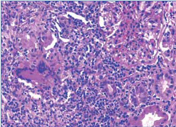 Figure 3. Interstitial lymphocytic infiltrate and epithelioid granuloma in the renal biopsy