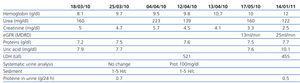 As part of the nephrology study, antinuclear antibodies (ANA), anticytoplasmic neutrophil antibodies (ANCA), anti-ADN antibodies and anti-glomerular basement membrane antibodies were negative. Viral serology was negative for the human immunodeficiency and hepatitis B and C viruses. The complement was normal. Urine tests initially showed a microalbuminuria/creatininuria index of 261.9mg/g and proteinuria/creatininuria of 1.1 with no nephrotic syndrome. The only information of note in the proteinogram was the monoclonal IgM peak, with a serum level of 305mg/dl, and negative urinary light chains.