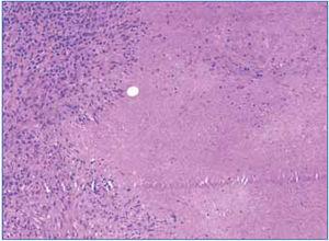 A cervical adenopathy biopsy was performed in which epithelioid granulomatous inflammation was observed with extensive caseous necrosis (Figure 1). A few bacilli were observed in the Ziehl-Nielsen stain (Figure 2).