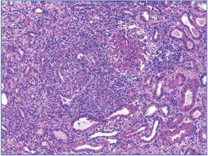 c) Tuberculosis with granulomatous interstitial involvement (our primary hypothesis). Included in the histological data of the biopsy supporting this hypothesis is the presence of Langhans cell granulomas, although caseous necrosis was not observed. The absence of acid-alcohol resistant bacilli in the renal biopsy and the lack of PCR of the sample prevents us from concluding that granulomatous interstitial nephritis due to tuberculosis was the definite diagnosis.2 However, the clinical picture of pulmonary tuberculosis and caseous necrosis in the cervical adenopathy biopsy almost certainly confirm the diagnosis.