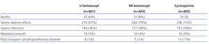 The safety profile analysis for belatacept after 3 years of treatment in the BENEFIT and BENEFIT-EXT studies included the data from 1209 patients. LI belatacept was associated with fewer deaths and cases of severe infection than MI belatacept and cyclosporine (Table 3).56 The risk of PTLD with belatacept (1% for each treatment schedule) was within the expected incidence rate following a kidney transplant,57 and decreased after 18 months.