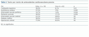 En la tabla 2 puede comprobarse cómo los pacientes que son exitus tienen más proporción de antecedentes previos de cardiopatía isquémica (CI), insuficiencia cardíaca (IC) y enfermedad vascular periférica (EVP). Sin embargo no encontramos diferencias en antecedentes de otros factores de riesgo cardiovascular como DM ó HTA. En el análisis de regresión logística la CI se mostró como el principal factor determinante de mortalidad (exp[B] 20,83, IC95% [3,29-131,9], P 0.001).
