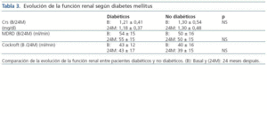 Igualmente al comparar la evolución del FGe entre los pacientes diabéticos y no diabéticos no hemos encontrado variaciones significativas con el paso del tiempo (tabla 3).