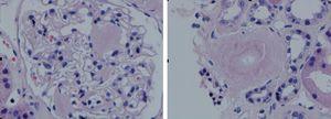 Figure 2. Haematoxylin-eosin test showing amorphous nodules in glomeruli and vessels
