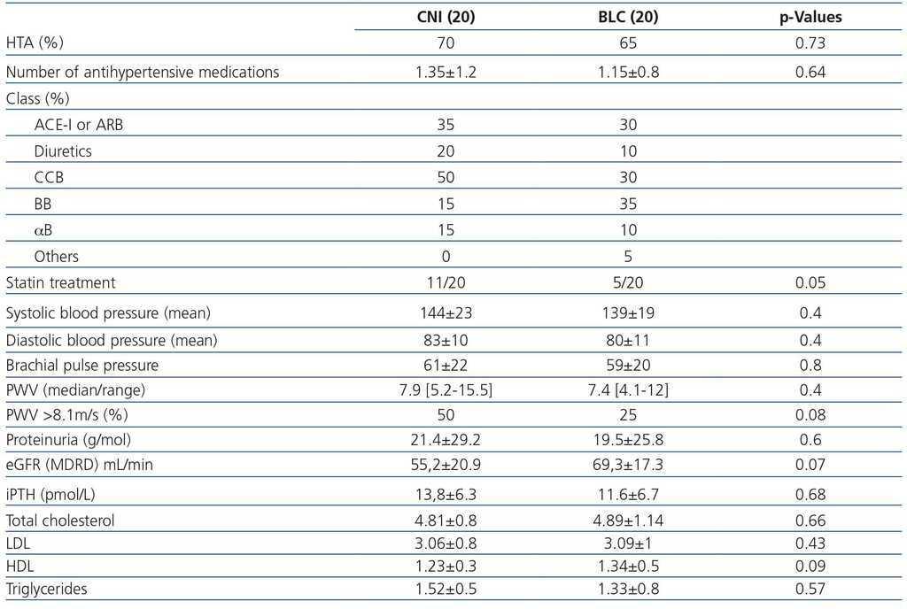 Hypertension prevalence was similar in both groups. Moreover, similar findings were observed regarding the number of antihypertensive medications, mean systolic pressure, diastolic pressure and brachial pulse pressure at the time of the test (Table 2). Also, no difference in inhibitor of renin system use (both ACE-I or ARB) was seen (p. 0.73 data not shown). CNI patients needed more commonly statins to control dyslipidemia. There were no differences in total cholesterol, LDL, HDL, triglycerides and PTH between the two groups. Also, no differences in smoking prevalence were seen (Table 1).