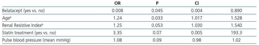 Because there is an important correlation between brachial pulse pressure and systolic blood pressure, only one of them must be selected for the multivariate model. We chose brachial pulse pressure since it has a higher correlation with cf-PWV than that observed with systolic blood pressure.2 Therefore, belatacept use, recipient age, renal resistive index, pulse blood pressure, proteinuria and statin use were considered in the multivariate logistic regression model (Table 4). Among these variables, recipient age and a high renal resistive index were independent predictors of a high cf-PWV. On the other hand, belatacept treatment was an independent predictor of a low cf-PWV.