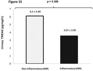 In patients with glomerulonephritis we did not find significance statistical in the uTWEAK levels when evaluated accord the etiology of glomerulonephritis (inflammatory GMN vs. non inflammatory GMN) 6.1±5.44 vs. 3.57±2.95, p=0.389 (Supplementary figure 1S).