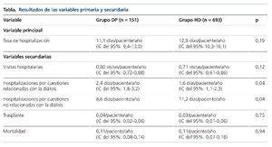 La variable de resultado principal fue comparar la tasa de hospitalización entre los 2 grupos. Las variables secundarias incluyen las causas específicas de hospitalización, y si estas estaban o no relacionadas con la diálisis, las razones para el cese del tratamiento dialítico y la tasa de visitas de enfermería al domicilio.