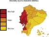 – In Ecuador, mortality caused by diabetes mellitus was higher in the provinces of Guayas, Los Ríos and Manabí, located on the Pacific coast. Map shows the mortality rate due to diabetes mellitus (deaths/100,000 individuals per year, INEC [Instituto Nacional de Estadísticas y Censos National Institute of Statistics and Census of Ecuador] 2011). This figure is part of a figure originally published by Neira-Mosquera et al.6, with minor modifications (authorised reproduction).
