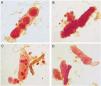 Elementos formes observados en el sedimento urinario del paciente. A) Cilindro con cuerpos ovales grasos. B) Cilindro granular y cuerpos ovales grasos. C) Cilindro de células tubulares y 2 células de urotelio en la parte inferior. D) Cilindro hialino (parte superior) y cilindro con inclusiones lipídicas (inferior izquierda). Tinción Sternheimer-Malbin, 40×, microscopia de campo claro.