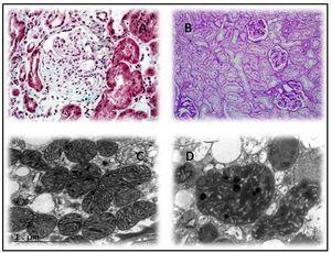 Segundo caso14: mujer de 19 años con antecedentes de HTA, hipoacusia neurosensorial desde la juventud, hipotiroidismo no autoinmune y una maculopatía pigmentada en el fondo de ojo. Sin antecedentes familiares de interés, es remitida a la consulta de nefrología por proteinuria no nefrótica. El estudio realizado que incluye un sedimento urinario sin microhematuria, autoinmunidad y serologías resultó negativo. En ese momento, se realiza una biopsia renal con material insuficiente, por lo que se repite cinco años después. Esta nueva biopsia presenta ocho glomérulos, ópticamente normales, IF sin hallazgos relevantes y con una microscopía electrónica no compatible con enfermedad de Alport, con megamitocondrias que presentan distorsión de las crestas y una matriz interna desestructurada (figura 2 B y figura 2 D). En su tercer embarazo (los dos primeros fueron abortos precoces) desarrolla una diabetes y un síndrome nefrótico masivo. Con el diagnóstico de probable GESF descompensada por el embarazo, se inicia tratamiento con esteroides y tacrolimus, a pesar de lo cual no se consigue un adecuado control del síndrome nefrótico y se evidencia un deterioro de la función renal. Finalmente, se decide interrumpir el embarazo por el sufrimiento fetal y el riesgo vital de la madre. La proteinuria regresó a valores no nefróticos y la función renal se normalizó, suspendiéndose la inmunosupresión. De nuevo, ante la asociación de diabetes, sordera, síndrome nefrótico corticorresistente (SNCR) y maculopatía pigmentada en el fondo de ojo, se solicita estudio genético de enfermedad mitocondrial, que confirma la sospecha clínica.