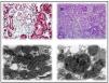 Primer caso14: varón de 38 años, con antecedentes de DMNID e hipertensión arterial (HTA) de tres años de evolución, así como hipoacusia neurosensorial desde la juventud y una miocardiopatía hipertrófica. Es remitido a la consulta de nefrología por proteinuria no nefrótica e insuficiencia renal crónica con creatinina de 2,4 mg/dl, con la sospecha de síndrome de Alport. Como antecedentes familiares, su madre es diabética, con hipoacusia y una insuficiencia renal crónica no filiada. Tras realizar un estudio completo con un sedimento de orina sin microhematuria, y autoinmunidad y serologías para virus de la hepatitis B, virus de la hepatitis C y virus de la inmunodeficiencia humana que resulta negativo, se practica una biopsia renal. Esta muestra ocho glomérulos, de los cuales tres están esclerosados, dos presentan lesiones de esclerosis segmentaria y focal con hialinosis, otros dos marcada fibrosis capsular y el restante una ligera hipercelularidad mesangial. Además, a nivel arteriolar se observa una intensa hialinosis subendotelial con marcada reducción luminal. La IF es negativa y en la ultraestructura se observan megamitocondrias en los podocitos (figura 2 A y figura 2 C). Debido a la asociación de DMNID, sordera, enfermedad renal y miocardiopatía hipertrófica en un paciente que además presenta un sedimento sin hematuria, se sospecha una enfermedad mitocondrial que queda confirmada tras realizar el estudio genético.