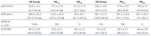 In our study, the prevalence of LVH was less (53.5% in HD vs 38.4% in PD). The lower presence of cardiac disorders may be due to acceptable control of hydration status and BP, a high presence of RRF, as well as good control over haemoglobin readings, calcium-phosphorus metabolism, and the use of ACEI and ARA II. The difference found between both dialysis techniques may be explained by the greater percentage of patients with no RRF in HD,31 the lower use of ACEI/ARAII, and greater extracellular water ratio. LAVI shows the average of increased filling pressures,42 the functional situation of the heart and overload, and thus, the hydration status. Patients on HD have a significantly greater LAVI than those on PD, and HHD patients have greater intravascular volume and therefore greater cardiac overload, leading to increased LVH.