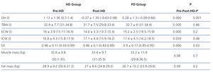 According to the data obtained using BCM, patients on HD had significantly greater overhydration (OH) and extracellular/intracellular (E/I) water than those on PD (Table 2).