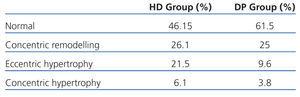 Left atrial volume indexed to body surface (LAVI) and indexed left ventricular mass (ILVM) were significantly greater in patients in the HD group and in the HHD subgroup of both techniques. The OH/ECW ratio was significantly greater in HD patients than in PD patients (>15%, 14.06% in HD vs 3.8% in PD), as well as in HHD patients in each type of dialysis.