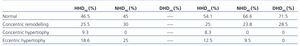 If we assess the geometry of the left ventricle in our study population, we observe the presence of LVH in 27.6% of the HD group and 13.4% in PD; the most prevalent in both groups being the eccentric one. According to the hydration status, the presence of LVH was greater in the HHD group (HD 27.9% vs PD 20.8%) than in the NHD group (25% vs 9.5%), with eccentric LVH being the most prevalent (Tables 4 and 5). In the univariate study of eccentric LVH with all variations, the only one of significance was eccentric LVH with hydration status (normalised ECW/TBW) with a significance of P=.03 (CI 1.1-11.5).