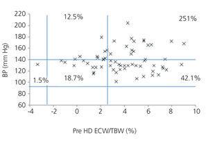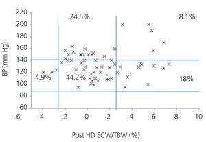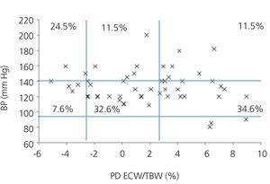 Figure 4. Distribution of patients on peritoneal dialysis according to blood pressure readings and the difference of the ECW/TBW ratio