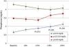 Changes in levels of calcium, phosphorus, PTH, and alkaline phosphatase, and changes in the excretion of calcium and phosphorus were parallel between patients with and without cinacalcet (Fig. 10). Baseline levels of calcium, PTH, and alkaline phosphatase were similar in both groups, as was the dose of paricalcitol used at the 6-month intervals. Patients with cinacalcet initially had slightly lower levels of phosphorus, although not significantly, and had parallel changes to patients without cinacalcet. Urinary excretion of calcium was higher in patients with cinacalcet, with no significant differences in its changes over the study period (Fig. 11).
