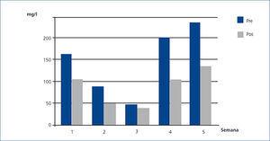 El caso número 2 era un FRA por MM IgG kappa con niveles de CLL previos a la primera sesión de HFR de 3642 mg/l. A partir de la tercera semana de tratamiento se observaron cifras de CLL en plasma que oscilaban alrededor de los 500 mg/l, que se hicieron inferiores a esta cifra y de forma sostenida a partir de la quinta semana. La tasa de reducción media por sesión en esta paciente fue del 53,8 %. La albúmina en sangre se incrementó levemente posdiálisis, probablemente debido a hemoconcentración (figura 3).