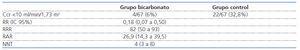 3. Circunferencia muscular del brazo: incremento en el grupo de bicarbonato. De 24,8 (23,7 a 25,8) a 26,3 (25 a 27,5) en el grupo de bicarbonato comparado con grupo control que no varía, 24,6 (23,5 a 25,7) a 24,5 (23,5 a 25,5) (p <0,03).
