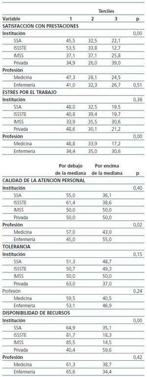 Por otra parte, sólo en seis de las variables se apreciaron diferencias en las percepciones entre medicina y enfermería. Los profesionales de medicina percibieron una mejor relación con sus superiores, se sintieron laboralmente más satisfechos y percibieron a sus unidades como más eficientes. En cambio, el personal de enfermería percibió mayor flexibilidad en sus horarios de trabajo, una mayor cantidad de estrés por el trabajo y una mejor atención personal.