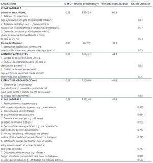 En la tabla 2 se exponen los factores identificados a partir de los análisis de factor exploratorios de las diferentes áreas del instrumento. Se presentan los valores de la prueba de adecuación muestral de Kaiser-Meyer-Olkin (K-M-O), la prueba de esfericidad de Bartlett y el porcentaje de varianza explicada de cada uno de los análisis. Además, se señalan los índices de consistencia interna (alfa de Cronbach) de cada uno de los factores determinados. De acuerdo con los criterios usualmente empleados en este tipo de análisis, tanto la prueba K-M-O como la de Bartlett tuvieron un valor >0,7 y p <0,05, respectivamente, e indicaron la pertinencia de los análisis de factor realizados. Asimismo, con excepción del factor «estrés por el trabajo», los índices de consistencia interna fueron adecuados, lo que indica una apropiada confiabilidad de los factores identificados.