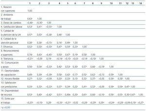 Tabla 3. Coeficientes de correlación (Rho de Spearman) de los factores del clima laboral, estructura organizacional y atención prestada en las unidades de hemodiálisis