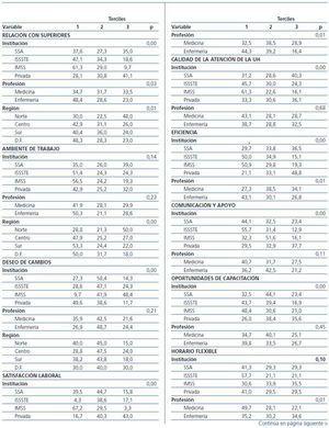 En la tabla 4a y tabla 4b se presentan los análisis por profesión, tipo de unidad y región geográfica. En nueve de las 14 variables se observaron diferencias significativas por tipo de unidad. Se aprecia una tendencia hacia la percepción de un mejor CL en las unidades privadas, comparadas con las públicas. Asimismo, destaca una peor percepción del ambiente laboral en las unidades del IMSS.