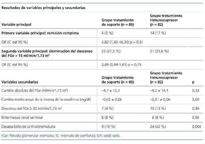 Descenso absoluto del FGe, disminución del FGe de al menos 30 ml/min/1,73 m2, necesidad de diálisis, cambio medio anual de la inversa de la creatinina, proteinuria a los 12 y 36 meses y desaparición de la microhematuria.