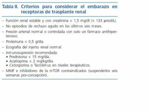 Nuestra experiencia del seguimiento del embarazo post-trasplante con la utilización de prednisona y tacrolimus es satisfactoria dado que prácticamente no ha habido complicaciones maternas ni fetales. Probablemente ello se debe a que las pacientes se adecuaban a las recomendaciones que tanto el «Report on the AST Consensus Conference on Reproductive Issues and Transplantation»6 como las Guías Europeas7 preconizan para plantearse un embarazo después del trasplante renal (tabla II).