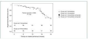 – Tampoco en la tasa de peritonitis: el 13 frente al 16%, p = 0,06 y 0,13, y 0,20 episodios/paciente/año, p = 0,3, para 3 y 4 inter-cambios, respectivamente. Se observa un mayor período libre de peritonitis en el grupo de 3 intercambios (análisis de Kaplan Meier con test log rank = 3,811; p = 0,05).