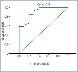 El resumen del modelo de regresión logística múltiple se muestra en la tabla 1. En el análisis univariante de factores asociados con EAC significativa se encuentra que el 65% de los pacientes con DM tipo 1 y el 81,3% de los pacientes con DM tipo 2 presentan lesiones significativas en arterias coronarias sin que haya una diferencia significativa entre los dos grupos (p = 0,279). No se ha encontrado significación estadística para las siguientes variables: edad (odds ratio [OR] = 1,042, p = 0,182), sexo femenino (OR = 0,368, p = 0,188), historia familiar de enfermedad coronaria (OR = 2,933, p = 0,212), hipertensión arterial (OR = 1,917, p = 0,511) y los valores de colesterol LDL (OR = 1,018, p = 0,222). Las únicas variables que se asociaron de forma significativa con la presencia de enfermedad coronaria fueron: la presencia de dislipidemia (OR = 10,857, p = 0,004), el tabaquismo (OR = 7,778, p = 0,009), el valor de hemoglobina glicosilada (OR = 9,523, p = 0,003) y el nivel de colesterol total (OR = 1,040, p = 0,01); que fueron las que posteriormente se incluyeron en el modelo de regresión logística múltiple. La dislipidemia y el colesterol total fueron eliminados del modelo (test de la razón de verosimilitud = 1,556, grado de libertad [GL = 2]). Todas las variables presentaron una escala lineal. Se valoran todas las posibles interacciones que son no significativas. Ningún paciente presenta una distancia de Cook superior a 1. El resultado final muestra como las únicas variables que se asocian de manera significativa con EAC son: el tabaquismo (OR ajustada = 8,341, p = 0,048) y el % de hemoglobina glicosilada (OR ajustada = 9,535, p = 0,006). Por cada 1% de aumento en el valor de la hemoglobina glicosilada, el riesgo de que un paciente diabético asintomático con ERCT presente EAC significativa es 9,525 veces superior a igualdad de las demás variables en la población; con una seguridad del 95% estaría comprendido entre 1,892 y 47,944. La curva COR se muestra en la figura 2.
