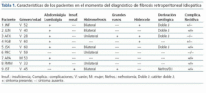 Concluimos que la FRI es una entidad clínica de presentación poco frecuente, de predominio en varones sobre los 50 años de edad, cuyo diagnóstico histológico puede ser realizado a través de biopsias percutáneas bajo control radiológico de scanner abdominal, y que su tratamiento, por su carácter patogénico, se basa hoy por hoy en la administración de corticoterapia. La derivación urológica ha de ser manejada conservadoramente mediante los procedimientos menos invasivos posibles como los catéteres doble J. Las recidivas suelen ser frecuentes, y han de ser tratadas de nuevo con prednisona, y posiblemente de nuevo con colocación de catéteres endoureterales. El pronóstico actual con estas medidas suele ser satisfactorio.