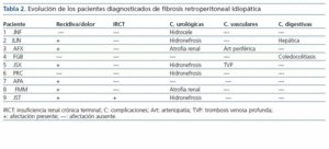 Exceptuando el paciente con mal pronóstico que inició hemodiálisis, los otros 8 pacientes presentaron las complicaciones referidas en la tabla 2. Un paciente que presentó predominio de afectación fibrótica peribiliar presentó coledocolitiasis como complicación a lo largo del seguimiento. Otro paciente también presentó en una biopsia hepática, realizada por colostasis disociada, lesiones de col angitis esclerosante y puentes de fibrosis hepática, pero no concluyentes de cirrosis. Este mismo enfermo había presentado seis años antes del diagnóstico de FRI, un episodio de pancreatitis aguda y paniculitis cutánea, por lo que se insistió especialmente en el diagnóstico diferencial con alguna vasculitis y la sarcoidosis.