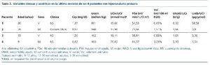 En cuanto a la función renal al diagnóstico, además de la hiperoxaluria, los 4 pacientes tenían incremento del volumen urinario, 3 de ellos defecto de la capacidad de concentración y 2, elevación de los valores de creatinina (tabla 1). Los valores de los ácidos glicólico y L-glicérico fueron normales en los pacientes 1 y 2.