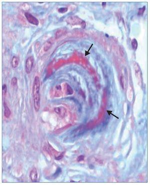 Figura 2. Fibrosis subintimal de la pared arteriolar con desdoblamiento de las fibras elásticas (flechas). Tinción de PAS (magnificación ×10).