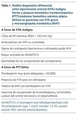 En resumen, presentamos un caso que ejemplifica la dificultad para diferenciar inicialmente la HTA maligna asociada a MAT de las otras MAT primarias como la PTT y el SHUa, con presentación clínica similar. Para el diagnóstico diferencial y la toma de decisiones terapéuticas precoces existen una serie de datos clínicos y analíticos (tabla 1), que pueden ayudar a los especialistas encargados de estos pacientes a orientar los casos desde el punto de vista práctico.
