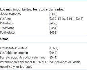 La alimentación moderna conduce a un consumo cada vez mayor de alimentos procesados en detrimento de productos frescos. En la manufacturación de estos alimentos se utilizan ampliamente aditivos fosfóricos dada la diversidad de sus aplicaciones: reguladores del pH, antioxidantes, estabilizantes proteicos, potenciadores del sabor, mejorantes del color, sales fundentes en quesos, mejoradores de masas y levaduras químicas1,2 (tabla 1). La proporción de fósforo ingerido a partir de estos aditivos es sustancial, aún más si tenemos en cuenta que no se acompaña de ingesta proteica3.