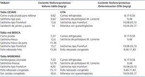 Tabla 5. Valores del cociente fósforo/proteínas de los productos cárnicos procesados según las tablas de composición de alimentos y su comparación con nuestros resultados